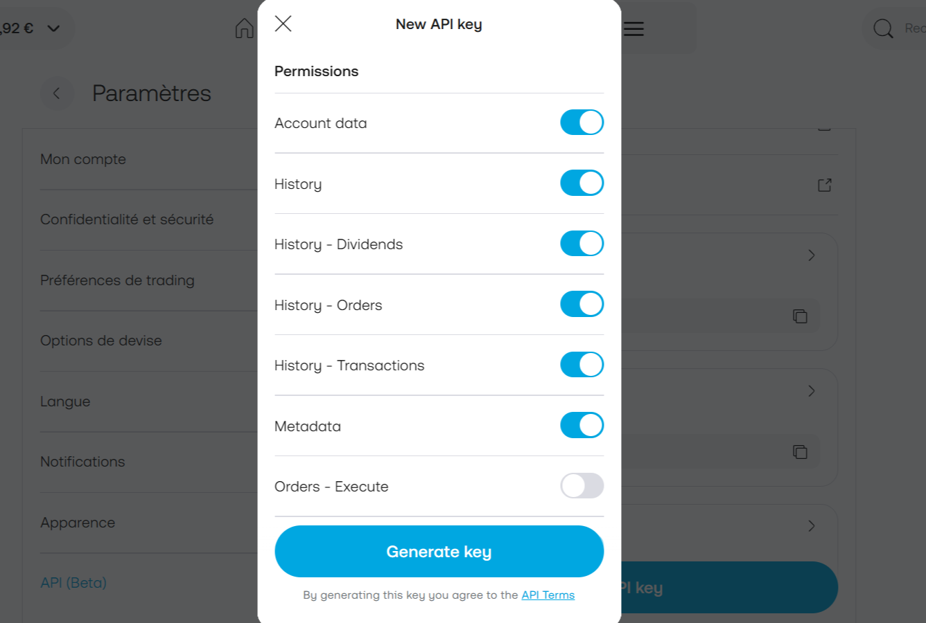 Cliquez sur "Generate key" et copiez/collez vos deux clés sur Invvest (ID de la clé d’API et clé secrète).